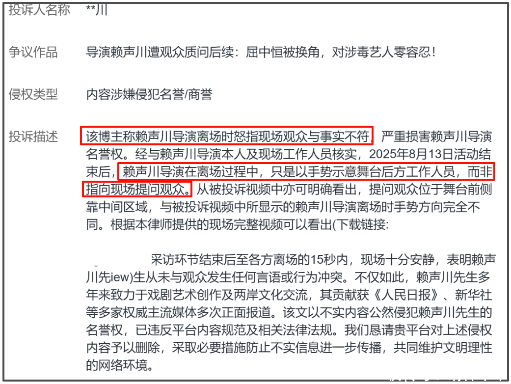 没想到导演赖声川启用涉毒艺人拍话剧的风波还有后续!近期,导演赖声川开始投诉有关他曾怒指现场观众的相关帖子,否认和观众发生冲突,还用官媒报道来给自己背书,却丝毫没有提及启用涉毒艺人一事。